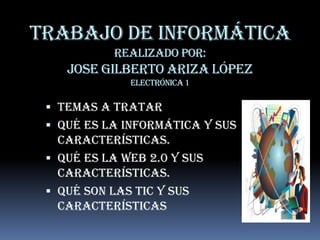 Este documento trata sobre la informática, la Web 2.0 y las TIC. Explica que la informática es el tratamiento automático de la información a través de computadores, y que se ha desarrollado desde el ábaco hasta los equipos modernos. La Web 2.0 permite servicios como redes sociales y blogs que facilitan el intercambio de información entre usuarios. Finalmente, las TIC son herramientas que procesan y presentan información a través de soportes como la computadora e Internet, y han cambiado la sociedad y la educación.