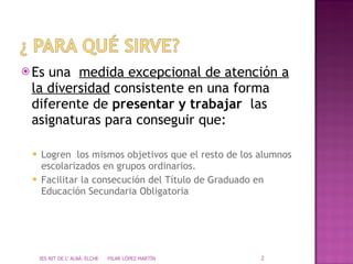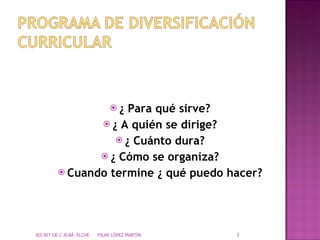El documento describe un programa de diversificación curricular para estudiantes con dificultades de aprendizaje. El programa dura un año y tiene como objetivo ayudar a los estudiantes a lograr los objetivos de 4o de la educación secundaria obligatoria. El programa se enfoca en las áreas lingüísticas, científicas y prácticas. Si los estudiantes superan los ámbitos del programa, obtendrán el título de graduado de educación secundaria obligatoria.