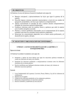 Este documento presenta el plan de estudios para el curso de Química General en la Universidad Mayor de San Simón. El curso se divide en 6 unidades temáticas y cubre temas como las leyes fundamentales de la química, estequiometría, estados de la materia, soluciones, termodinámica, cinética química y equilibrio químico. El curso utiliza métodos de enseñanza como exposiciones magistrales y resolución de ejercicios, y los estudiantes serán evaluados a través de