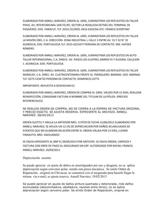 1. El documento contiene varias órdenes de compra y reparación relacionadas con siniestros de seguros de vehículos.