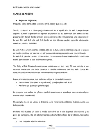El documento presenta la bitácora de una clase de Tecnologías de la Información y Comunicación (TIC) en la que se discutieron los siguientes temas: la evolución de la web, el uso de herramientas digitales como bitácoras y blogs, y el concepto de comunidades virtuales. En la clase se explicaron estas herramientas y conceptos, y se propusieron actividades como la creación de presentaciones y videos para subir a plataformas en línea. El objetivo final es que los estudiantes aprendan a utilizar la tecn