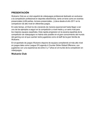 Wulcanix Club es un club español dedicado a la competición profesional de deportes electrónicos desde 2011. Cuenta con equipos en League of Legends y Counter Strike: Global Offensive y busca patrocinadores para financiar servicios, premios y publicidad para los equipos.
