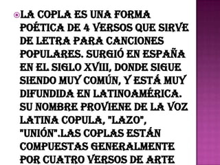 La lacopla es una forma poética de 4 versos que surgió en España en el siglo XVIII y se usa para letras de canciones populares. Consiste en cuatro versos generalmente de arte mayor con rima consonante y trata temas variados como amor, desgracias o valentía. El nombre proviene de la palabra latina "copula" que significa unión.