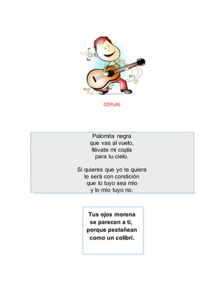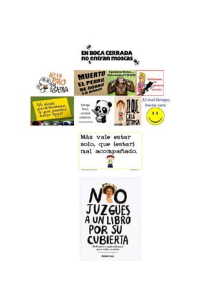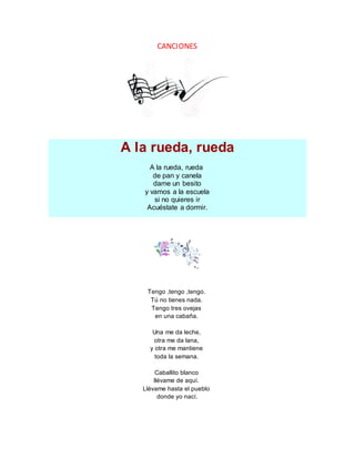 Este documento contiene varios poemas, canciones infantiles, refranes y parábolas bíblicas. En particular, incluye la Parábola de la oveja perdida de Jesús, en la que un pastor deja a 99 ovejas para buscar a la que se extravió, y se alegra más por su regreso que por las 99 que no se perdieron. También presenta la Parábola del trigo sobre el crecimiento del Reino de Dios en el alma humana y la Parábola del caballo que logra salir de un pozo a