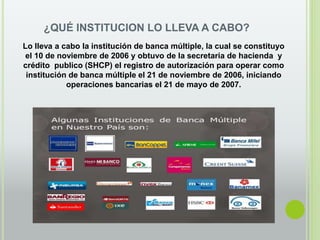 El documento describe la creación de software para el control de calidad en una institución de banca múltiple en México, que comenzó a operar en 2007. Destaca su responsabilidad social al brindar apoyo a los clientes en problemas financieros y su compromiso con un desarrollo sustentable mediante opciones de pago accesibles. Además, se mencionan los insumos utilizados, los beneficios del software, riesgos potenciales y la calidad de su diseño, así como la satisfacción del cliente al utilizar la aplicación.