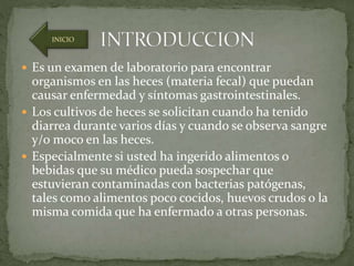 Este documento describe los pasos para realizar un examen de cultivo de heces. Incluye la toma de muestra, siembra e inoculación en medios de cultivo, examen macroscópico y microscópico de las colonias, y pruebas bioquímicas para identificar bacterias. El objetivo es detectar organismos en las heces que puedan causar enfermedades gastrointestinales.