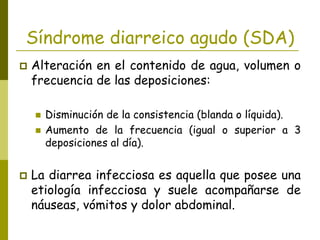 El documento describe el síndrome diarreico agudo, incluyendo sus principales agentes etiológicos como rotavirus, E. coli, Shigella y Salmonella. Explica que es una causa importante de morbilidad y mortalidad en niños y que se transmite principalmente por ingestión de agua o alimentos contaminados. Además, detalla los procedimientos recomendados para el procesamiento de muestras de coprocultivo para identificar los patógenos causantes.