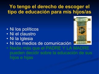 El documento argumenta que los padres tienen el derecho de elegir el tipo de educación para sus hijos y que nadie más puede decidir sobre la educación de los hijos sin su consentimiento. Defiende que la clase de religión en la escuela debe enseñarse de manera académica y sistemática por un profesor especializado para que los hijos puedan optar con libertad entre ser creyentes, ateos o agnósticos cuando sean mayores. Finalmente, sostiene que la religión está presente en muchos aspectos de la sociedad y que los hijos deb