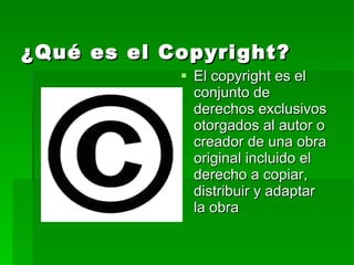 El documento resume los conceptos de copyright, Creative Commons y fair use. El copyright otorga derechos exclusivos a los autores sobre sus obras originales, como copiar, distribuir y adaptar. Creative Commons ofrece licencias alternativas al copyright que permiten compartir obras bajo ciertas condiciones, como reconocimiento de autoría o fines no comerciales. El fair use permite el uso limitado de obras protegidas para fines educativos u otros sin permiso, considerando factores como el propósito, naturaleza y cantidad utilizada.