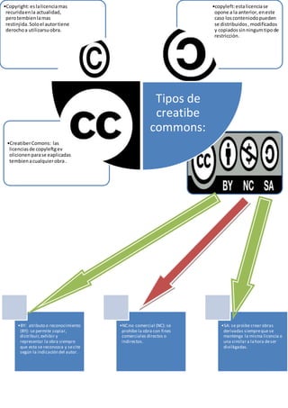 El documento describe tres tipos de licencias creativas comunes: copyleft, que permite la libre distribución, modificación y copia de obras; copyright, que otorga todos los derechos al autor; y Creative Commons, que ofrece varias opciones como reconocimiento de autoría, uso no comercial y prohibición de obras derivadas.