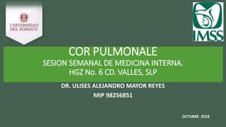 El documento describe el cor pulmonale, definiéndolo como la alteración estructural y deterioro funcional del ventrículo derecho resultado del aumento de presiones pulmonares asociado con enfermedades pulmonares o vasculares. Explica que puede presentarse de forma aguda o crónica y progresiva, y analiza las causas más comunes como EPOC, enfermedades intersticiales, tromboembolismo pulmonar y apnea del sueño. Finalmente, detalla los métodos de diagnóstico y las opciones de tratamiento disponibles que incluyen
