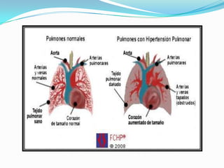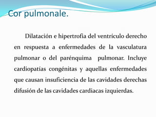 Este documento describe Cor pulmonale e Hipertensión pulmonar. Cor pulmonale se define como la dilatación e hipertrofia del ventrículo derecho en respuesta a enfermedades de los pulmones o vasos pulmonares. Las causas más comunes son EPOC y bronquitis crónica. La hipertensión pulmonar se divide en primaria y secundaria, siendo esta última causada principalmente por enfermedades pulmonares, cardiacas o del colágeno. Los síntomas incluyen disnea y dolor torácico. El diagn