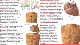 El documento describe la anatomía y fisiología del corazón. Es un órgano muscular hueco formado por cuatro cámaras que bombea sangre a través de la circulación pulmonar y sistémica. Contiene detalles sobre su tamaño, ubicación, estructuras internas como las cámaras, válvulas y vasos sanguíneos coronarios, así como sobre el ciclo cardíaco, potencial de acción y electrocardiograma.