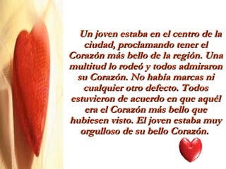 Un joven proclamaba tener el corazón más bello de la región. Aunque su corazón parecía perfecto, un anciano mostró su corazón lleno de cicatrices y agujeros. El anciano explicó que cada marca representa a alguien a quien amó y compartió su corazón. Aunque imperfecto, el anciano no cambiaría su corazón. Esto hizo que el joven comprendiera que la verdadera belleza está en el amor compartido, no en la perfección física. Arrancó un pedazo