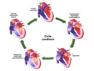 Este documento describe la anatomía y fisiología del corazón. Explica que el corazón funciona como dos bombas separadas y describe las características del músculo cardíaco, incluyendo su automatismo, conductibilidad y contractilidad. También describe el ciclo cardíaco, los factores que regulan el gasto cardiaco como la precarga, postcarga y contractilidad, y el control del corazón por los nervios simpáticos y parasimpáticos.