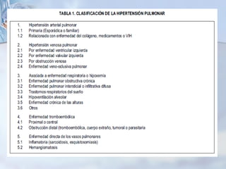 El documento habla sobre el corazón pulmonar, que ocurre cuando una enfermedad pulmonar causa presión alta en los vasos pulmonares, lo que sobrecarga el ventrículo derecho. Las causas más comunes son la EPOC y las embolias pulmonares. Los síntomas incluyen disnea y signos de insuficiencia cardíaca derecha. El diagnóstico se realiza mediante exámenes físicos, radiografías de tórax, pruebas de función pulmonar y ecocardiogramas. El tratamiento se enfoca en la