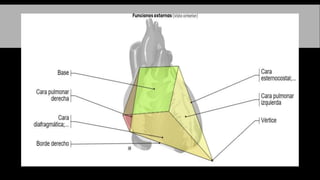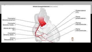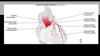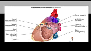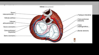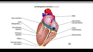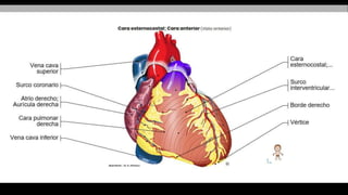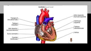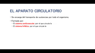 El documento describe la anatomía del sistema circulatorio. Está formado por el sistema cardiovascular, por el que circula la sangre a través del corazón y los vasos sanguíneos, y el sistema linfático, por el que circula la linfa a través de vasos y ganglios linfáticos. El corazón es un órgano muscular hueco formado internamente por cuatro cavidades que bombean la sangre a los pulmones y al resto del cuerpo a través de la circulación pulmonar y la circulación sistémica.