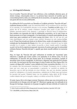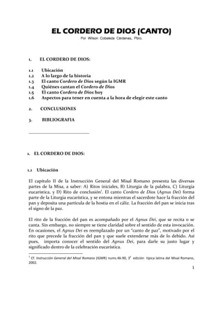 Este documento describe la historia y significado del canto "Cordero de Dios" (Agnus Dei) en la misa católica. Explica que originalmente se cantaba durante la fracción del pan para conmemorar el sacrificio de Cristo. A lo largo de los siglos, su ubicación y forma han cambiado, pasando a cantarse después de la fracción y reduciéndose a tres invocaciones. Actualmente se canta durante la distribución de la comunión para honrar a Cristo presente en la Eucaristía.