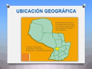 El departamento de Cordillera es el tercero de Paraguay, ubicado en el centro oeste de la región oriental, con una superficie de 4948 km² y una población de 282,981 habitantes. Su capital es Caacupé e incluye 22 distritos, siendo notable la Basílica de Caacupé y el lago Ypacaraí. Además, se destacan sitios turísticos como el museo Hassler y el cerro Tobatí.
