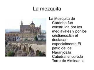 Córdoba es una ciudad andaluza situada a orillas del río Guadalquivir y al pie de la Sierra Morena, conocida por sus calles y monumentos construidos principalmente por los romanos como el Puente Romano y la Noria romana. Entre sus monumentos más destacados se encuentran la Mezquita, construida originalmente por los musulmanes y luego convertida en catedral por los cristianes, la Medina Azahara, palacio del siglo X mandado construir por Abd al-Rahman III, y la Sinagoga, la única que qu