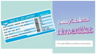 Este documento presenta información sobre un vuelo con destino a Corea del Sur. Incluye detalles sobre la tripulación, instrucciones de vuelo, objetivos del vuelo como describir aspectos de la historia, geografía, situación política y económica de Corea del Sur, e identificar factores clave de su éxito. También presenta secciones sobre la geografía, historia, política y economía de Corea del Sur.