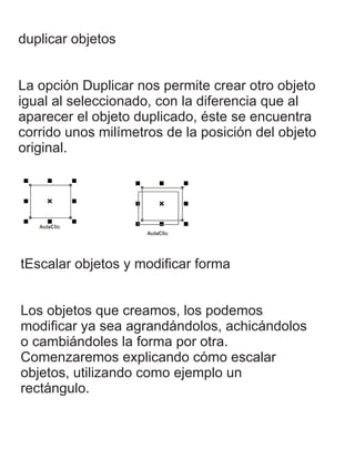 El documento proporciona instrucciones sobre cómo mover, duplicar, escalar y modificar la forma de objetos en CorelDRAW X5. También explica cómo aplicar diferentes tipos de rellenos como uniforme, degradado lineal, degradado radial, y de patrón de dos colores a los objetos.