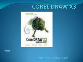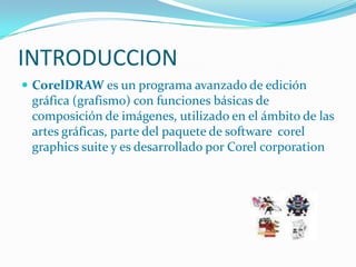 CorelDRAW es un programa de edición gráfica basado en vectores que se usa para editar logotipos, invitaciones y otros gráficos. El documento describe las versiones de CorelDRAW, incluyendo los requisitos del sistema, las partes que componen la interfaz como la barra de menús y el área de trabajo, y provee ejemplos de gráficos creados en CorelDRAW.