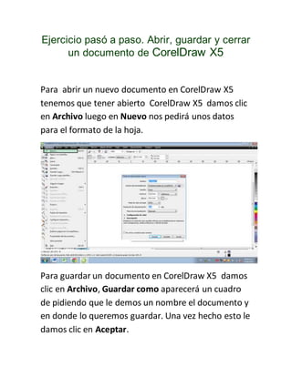 El documento proporciona instrucciones paso a paso para realizar varias tareas básicas en CorelDraw X5, como abrir y guardar un documento, crear objetos geométricos, copiar y duplicar objetos, y aplicar relleno uniforme. Explica cómo usar las herramientas y menús de CorelDraw para completar cada tarea.