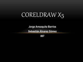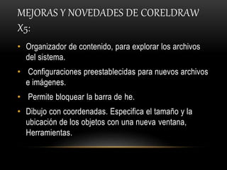 Este documento describe las mejoras y novedades de CorelDraw X5, incluyendo un organizador de contenido, configuraciones preestablecidas para archivos e imágenes, y la capacidad de bloquear la barra de herramientas. También explica cómo iniciar y cerrar CorelDraw X5 y los componentes fundamentales de la pantalla inicial como las barras y la zona de trabajo.