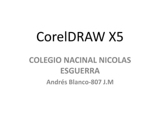 Este documento proporciona una introducción a CorelDRAW X5, un programa de dibujo vectorial. Explica cómo iniciar y cerrar el programa, y describe los componentes principales de la pantalla inicial como la barra de menús, la barra de herramientas, la barra de estado y las ventanas acoplables. También cubre cómo crear ilustraciones profesionales y enviar gráficos a servicios de impresión desde CorelDRAW X5.
