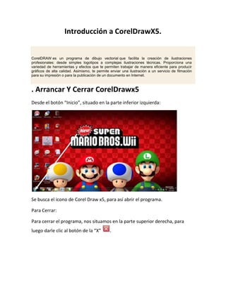 Este documento presenta una introducción al programa CorelDrawX5. Explica cómo abrir y cerrar el programa, realizar operaciones básicas como abrir y guardar archivos, y cómo crear y manipular objetos mediante herramientas como rectángulo, copiar y pegar. El documento proporciona instrucciones paso a paso para llevar a cabo estas tareas básicas en CorelDrawX5.