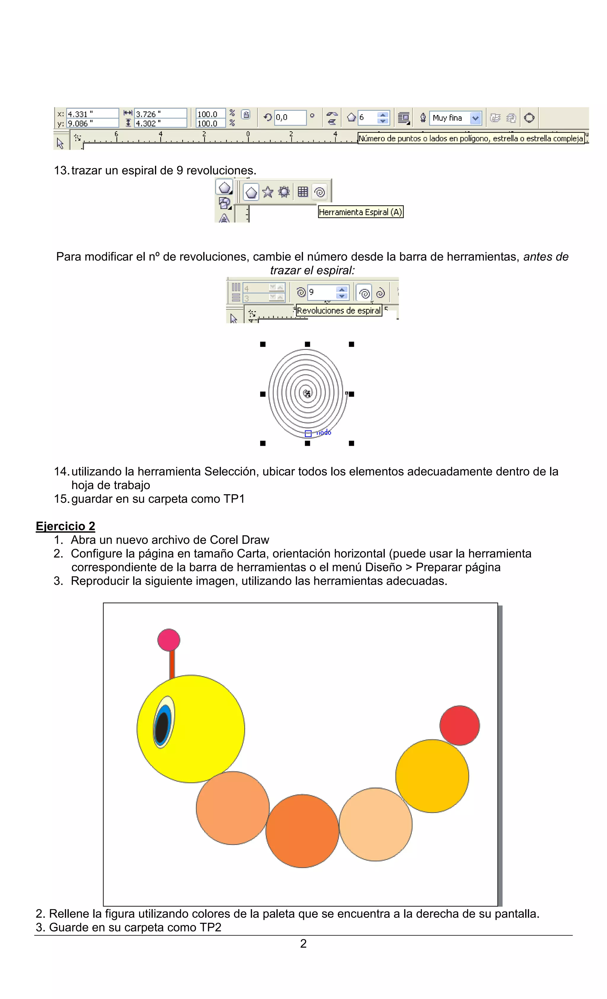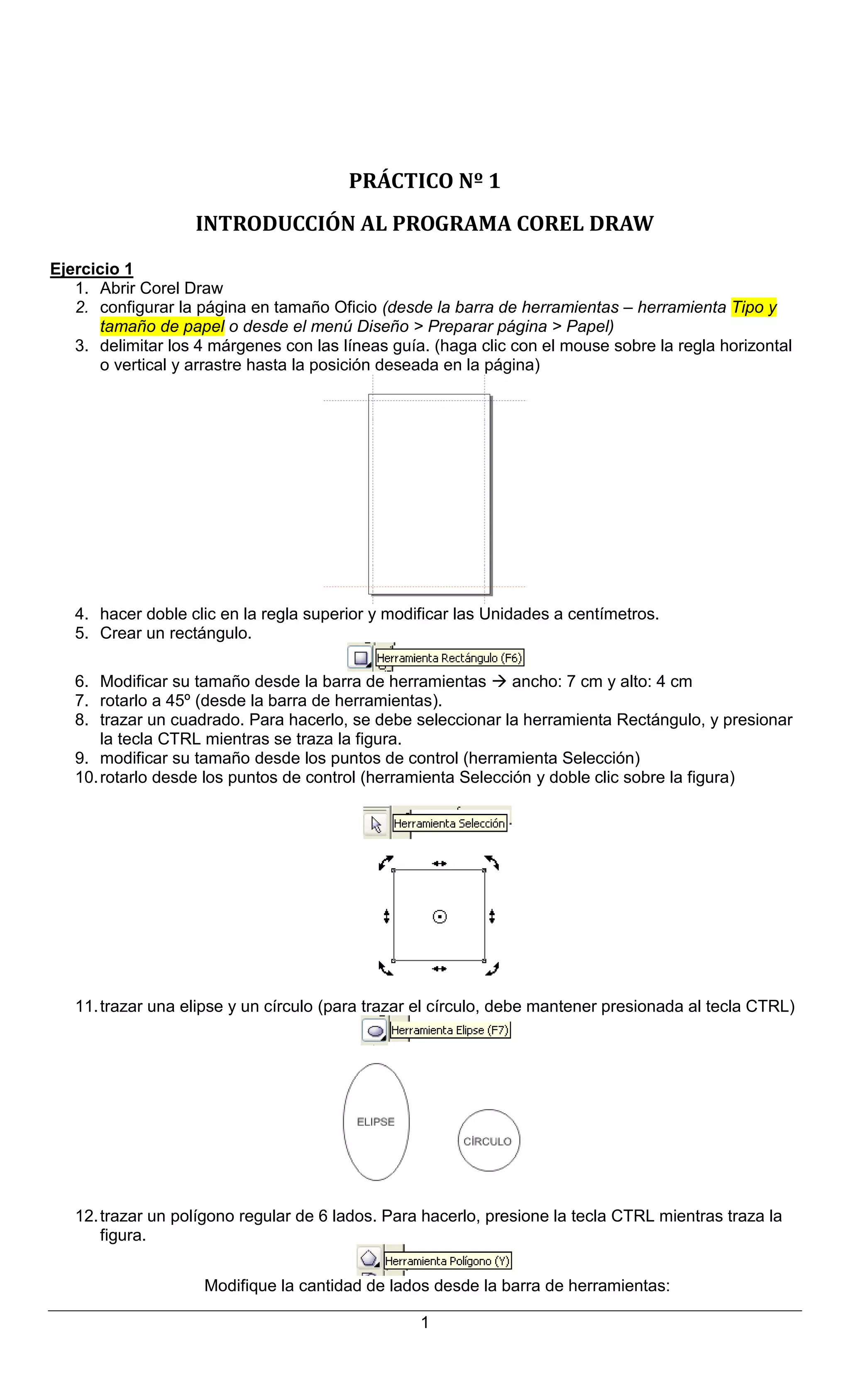 Este documento presenta un práctico de introducción al programa CorelDRAW. Incluye ejercicios para crear formas geométricas y figuras utilizando diferentes herramientas, aplicar colores y rellenos, y manipular nodos para modificar formas. El estudiante deberá completar los ejercicios y guardar los archivos resultantes.