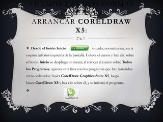 Este documento resume dos formas básicas de iniciar CorelDraw X5: desde el botón Inicio o desde el menú Todos los Programas. También describe algunas mejoras y novedades de CorelDraw X5 como el Organizador de contenido, configuraciones preestablecidas, compatibilidad con Windows 7 y pantallas táctiles, y nuevas herramientas como B-Spline y SWiSH miniMax. Finalmente, explica que la pantalla inicial muestra los componentes fundamentales de CorelDraw X5.
