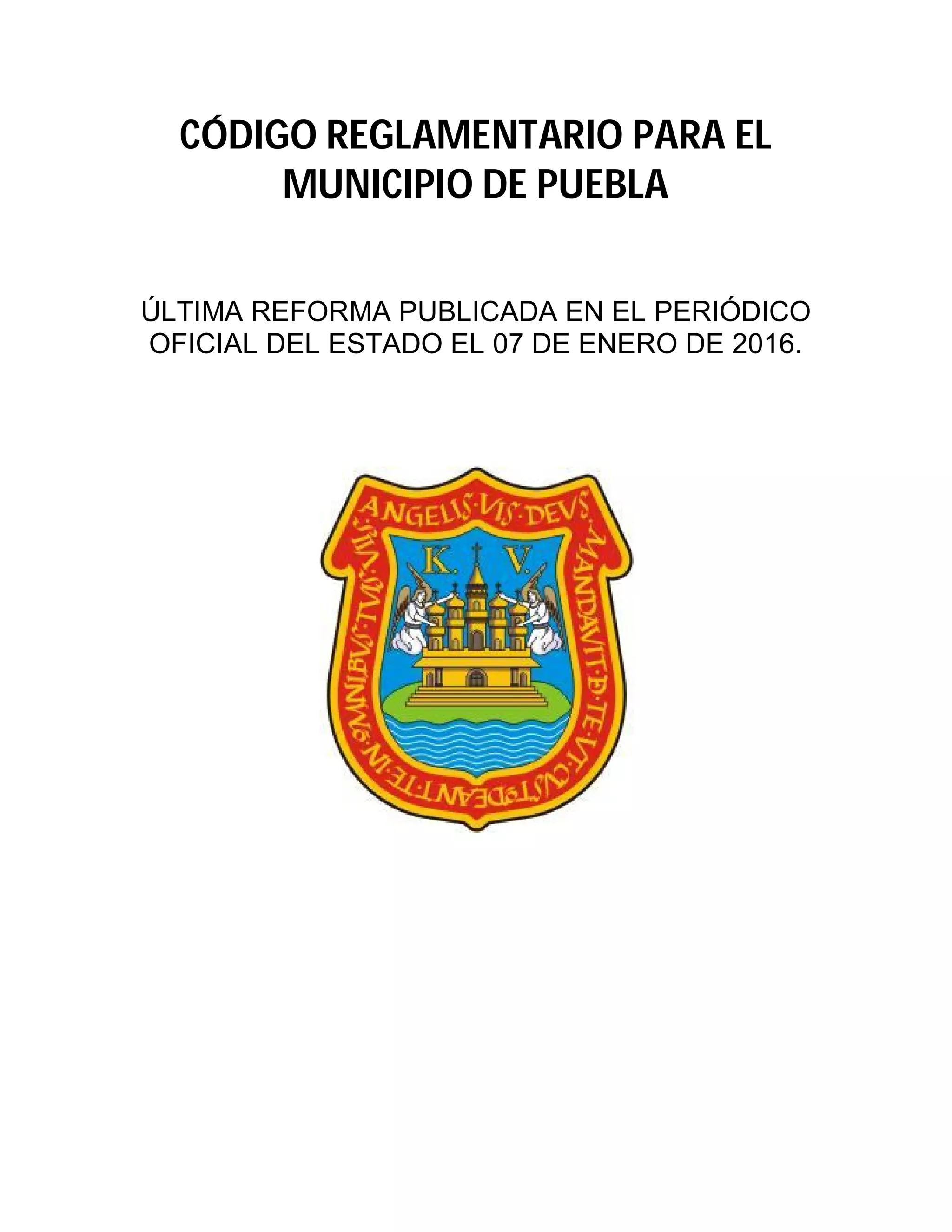 El documento detalla el código reglamentario del municipio de Puebla, abarcando diversas disposiciones sobre el gobierno municipal, justicia, seguridad, y actividades ciudadanas, incluyendo normas sobre espectáculos, comercio, y urbanismo. Se organiza en libros y títulos que especifican artículos sobre instituciones, procedimientos y sanciones. La última reforma fue publicada el 07 de enero de 2016.