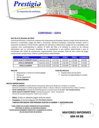 La feria CORFERIAS-SOFA se celebrará del 18 al 21 de octubre de 2012 en Bogotá y reunirá sectores como internet, multimedia, juegos de video, literatura fantástica, cómics, ciencia ficción y más. El documento también incluye información sobre tres hoteles cercanos a la feria con sus tarifas por noche y detalles sobre inclusión de desayuno, traslados y seguro hotelero.