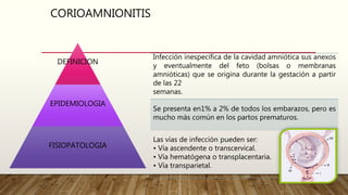 La corioamnionitis es una infección de la cavidad amniótica y sus anexos que se origina durante el embarazo a partir de las 22 semanas. Se presenta en el 1-2% de los embarazos y es más común en partos prematuros. Los principales microorganismos causantes son los que se encuentran normalmente en la vagina. El tratamiento incluye antibióticos, culminar la gestación lo antes posible y resolver cualquier complicación.