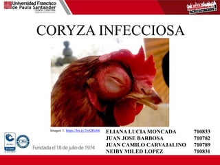 La coriza infecciosa es una enfermedad aguda causada por la bacteria Haemophilus paragallinarum que afecta principalmente las aves de corral. Provoca inflamación en la cara y ojos, estornudos y descargas nasales. Puede causar reducción en la producción de huevos, retraso en el crecimiento y pérdida de peso. Se transmite por contacto directo entre aves infectadas o por medio de bebederos y comederos sucios. El tratamiento incluye antibióticos y una dieta blanda, mientras que