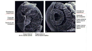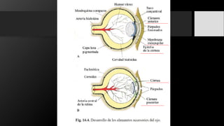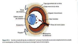 La córnea se origina de tres fuentes: el epitelio corneal, el mesénquima y el endotelio corneal. El mesénquima forma tres ondas de crecimiento que dan lugar al endotelio, estroma y estroma del iris. El estroma corneal se desarrolla entre el epitelio y el endotelio, separándolos. La membrana de Descemet y la lámina de Bowman aparecen entre el tercer y quinto mes. La esclerótica se desarrolla a partir del mesénquima que rodea la copa óptica, consolidándose primero en