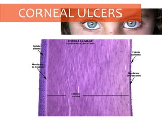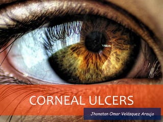 Las úlceras corneales son lesiones que causan la pérdida de tejido en la superficie de la córnea. Pueden ser causadas por virus, bacterias, hongos o parásitos como Acanthamoeba después de un trauma ocular o uso prolongado de lentes de contacto. Los síntomas incluyen visión borrosa, dolor ocular y secreción. El tratamiento depende de la causa subyacente e involucra medicamentos tópicos como antibióticos, antifúngicos o diamidinas aplicados varias veces
