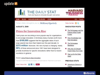 El documento resume varios temas relacionados con la innovación como las tecnologías disruptivas, los nuevos modelos de negocio, la educación disruptiva y la innovación abierta. Destaca que la innovación no es solo tecnología sino también valor para el cliente, y que es más importante reinventar los modelos de negocio que innovar en productos o servicios. Finalmente, analiza cómo la innovación está transformando el servicio al cliente a través de nuevas tecnologías.
