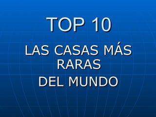 Este documento presenta una lista de las 10 casas más raras del mundo, incluyendo una casa con un ángulo de 135 grados construida por arquitectos orientales, y un edificio en Florida con más de 100 exhibiciones interactivas que es popular entre los artistas.