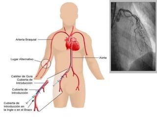 La coronariografía es un procedimiento de diagnóstico por imagen que permite visualizar las arterias coronarias. Se utiliza principalmente para confirmar o descartar enfermedades de las arterias coronarias como el infarto o la angina de pecho. El documento describe el procedimiento de coronariografía, sus indicaciones, contraindicaciones, cuidados de enfermería antes, durante y después del procedimiento.