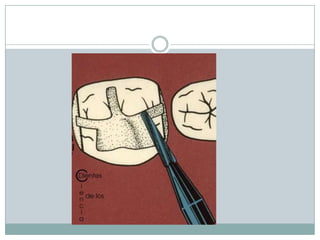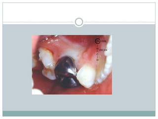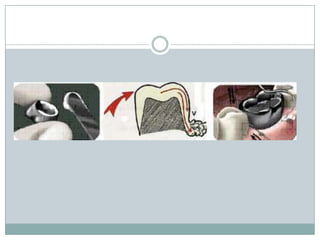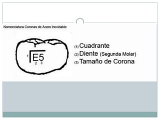 Las coronas de acero inoxidable ofrecen ventajas como su durabilidad, bajo costo y fácil colocación. Se usan para tratar caries, fracturas y bruxismo. Su colocación implica preparar el diente, seleccionar la corona adecuada, ajustar los márgenes y cementarla. Es importante que la corona se adapte bien sin causar daño a los tejidos. Las complicaciones como inflamación gingival pueden ocurrir si la corona no se ajusta correctamente.