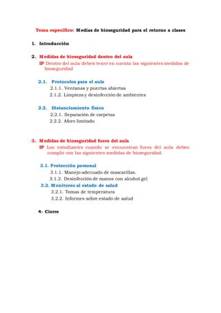 El documento describe las medidas de bioseguridad necesarias para el retorno a clases presenciales durante la pandemia. Dentro del aula, se deben implementar protocolos como ventanas y puertas abiertas, limpieza y desinfección, y distanciamiento físico entre estudiantes. Fuera del aula, los estudiantes deben usar mascarillas, desinfectarse las manos, y someterse a monitoreo de temperatura y reporte de síntomas.