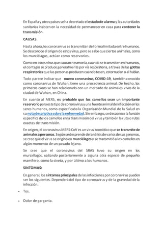 Los coronavirus son una familia de virus que pueden causar desde un resfriado común hasta síndromes respiratorios graves. En los últimos años se han descrito tres brotes importantes causados por coronavirus: el SRAS en 2002, el MERS en 2012 y el COVID-19 detectado a finales de 2019 en China. Los coronavirus se transmiten principalmente a través de gotitas respiratorias y tienen su origen en animales como murciélagos y camellos. Sus síntomas van desde tos y fiebre hasta dificultad respiratoria. Actualmente no existe una vacuna específica, por lo que