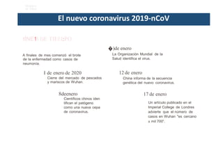 El documento describe el brote de un nuevo coronavirus (2019-nCoV) detectado en Wuhan, China a finales de diciembre de 2019. Hasta el 27 de enero se reportaron más de 4400 casos en China y 65 casos fuera de China, con una letalidad general de 2.39%. El virus se transmite de persona a persona y su número reproductivo básico está entre 1.4 y 2.5. Los síntomas más comunes son fiebre, tos seca y disnea.