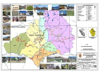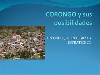 El documento presenta información sobre la provincia de Corongo en la región de Ancash, Perú. Detalla sus cifras demográficas, objetivos de desarrollo, infraestructura en educación, salud y agricultura, así como sus fortalezas como recursos turísticos y oportunidades de crecimiento a través de proyectos de inversión e incremento de presupuesto.