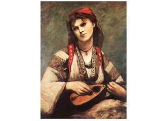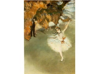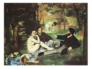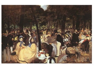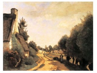 El documento analiza las contribuciones de Camille Corot, Édouard Manet y Edgar Degas al impresionismo y otros estilos de arte en el siglo XIX. Estos artistas, aunque presentan características distintas y no se adhieren a una sola corriente, fueron innovadores que influyeron en el desarrollo de la pintura moderna. Corot se destaca por su enfoque en la luz y el color, Manet por su tratamiento pictórico de la realidad contemporánea, y Degas por su interés en el movimiento y la vida urbana.