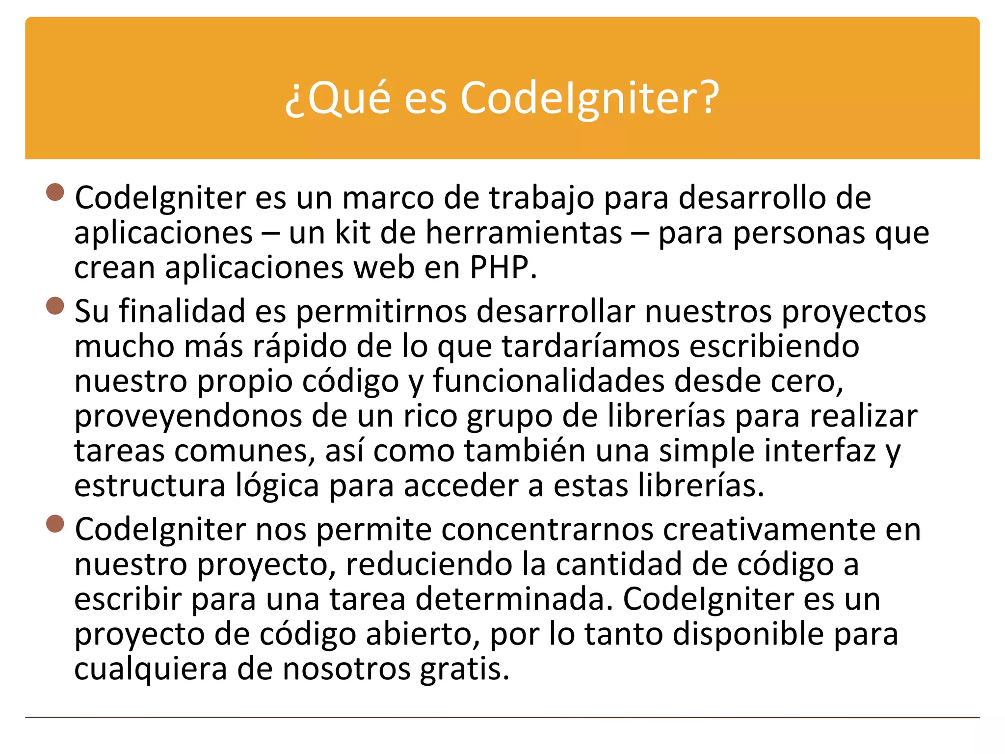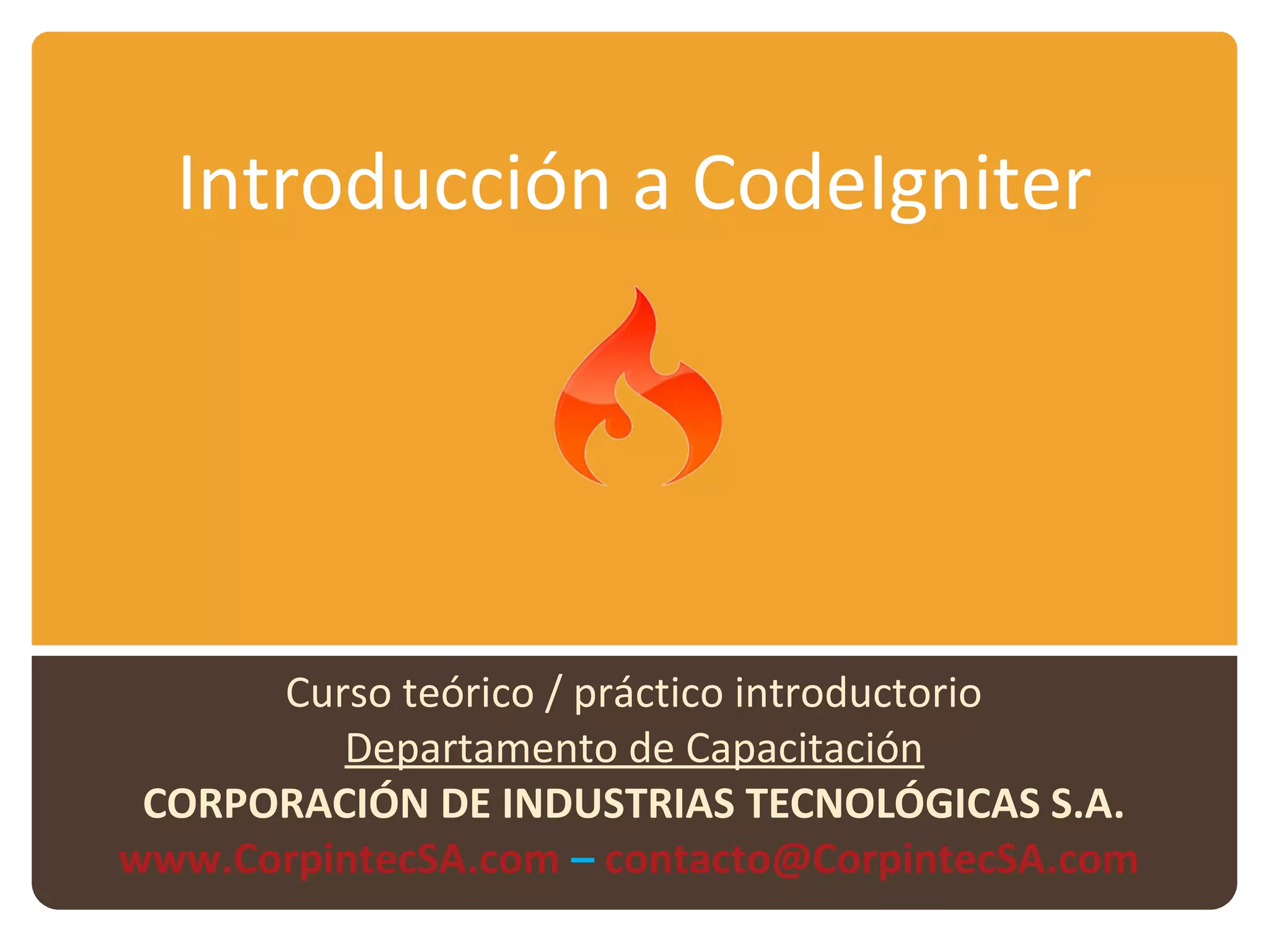 El documento es un curso introductorio sobre CodeIgniter, un marco de trabajo para el desarrollo de aplicaciones web en PHP que permite crear proyectos rápidamente con una estructura lógica y librerías integradas. Se explica su instalación, características, el patrón de diseño MVC, y la funcionalidad de controladores, modelos y vistas, destacando su simplicidad y eficiencia. Además, se aborda cómo cargar modelos, helpers y librerías para optimizar el desarrollo en CodeIgniter.