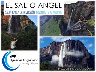 El documento describe El Salto Ángel, la catarata más alta del mundo ubicada en Venezuela. Ofrece dos paquetes turísticos para visitarla, incluyendo transporte, caminatas y actividades. Destaca que mantiene su virginidad natural, fue fuente de inspiración para la película Up y es una experiencia única e inolvidable debido a su belleza, flora y fauna. Testimonios de visitantes la describen como enriquecedora, emocionante e increíble.
